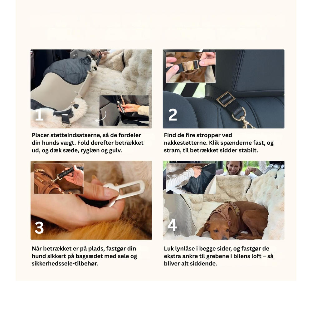 Vores bilseng er skabt til at give din hund en stabil og komfortabel plads i bilen. Den bløde polstring absorberer bevægelser fra kørslen og støtter kroppen, så din hund kan ligge roligt – selv på længere ture.